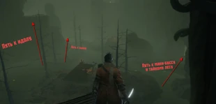- Бусина от чёток - 1 шт. после победы над мини-боссом, войдя в пещеру позади нее и посмотрев вверх Волк увидит точку захвата. Продолжая движение, волку придется пригнуться, чтобы пройти мимо двух низко висящих камней. Остановившись между ними двумя и прыгнув вверх по скале, Волк сможет по стене запрыгнуть на вершину статуи, где он найдет молитвенную бусину.