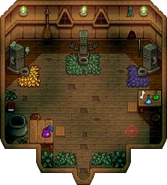 Внутри хижины ведьмы три алтаря, волшебные чернила для волшебника (на столе в лиловом пузырьке) и красная руна телепортации на полу. Если вернуть чернила волшебнику, вы получите доступ к пяти новым зданиям для фермы. Если наступить на руну, вы перенесетесь прямо в подвал башни волшебника. Руны телепортации в хижине и подвале башни можно использовать в любое время после выполнения задания «Гоблин-сторож».