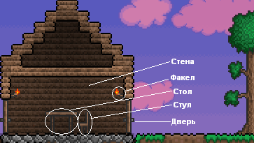Вскоре вам для облегчения игры понадобятся НИПы. Чтобы они обжились в доме, необходимо наличие поставленной двери. Удалите три вертикальных блока (под рост персонажа) и поставьте на их месте дверь. После этого следует поставить фоновые стены в доме (каменные или деревянные). Фон дома должен быть полностью заполнен. Смастерите факел и поместите его внутри здания. Этот источник света необходим НИПу для проживания. Вам также понадобятся одно рабочее место и один предмет комфорта. Простейший вариант — комната 10 × 6 (для экономии дерева можно сделать её из платформ), также нужны стол и стул, но можно, например, поставить и кровать с верстаком (см. на картинке №2).